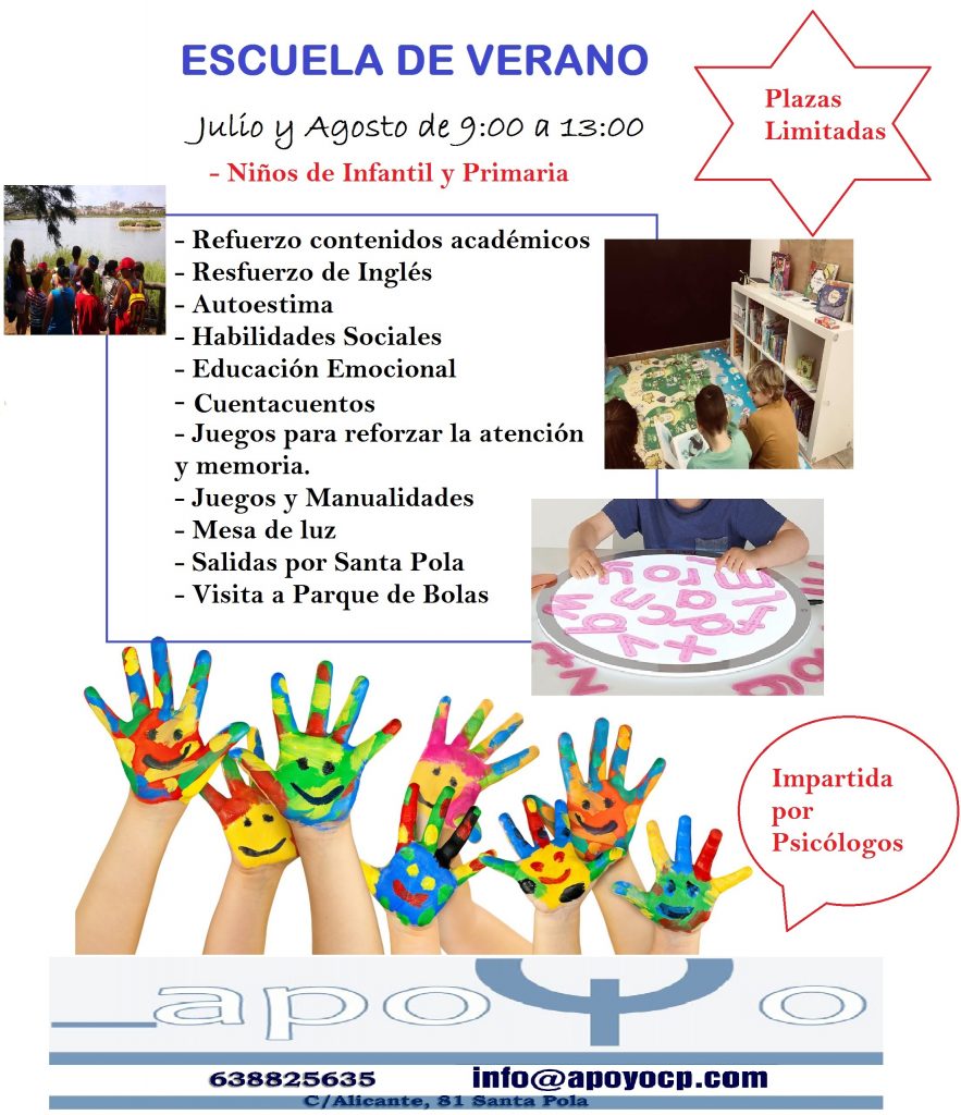 ESCUELA DE VERANO 2018 Una escuela de verano diferente, dirigida por psicólogos. Si quieres que tu hijo/a continúe aprendiendo divirtiéndose durante el verano en Santa Pola puede hacerlo. El verano es […]
